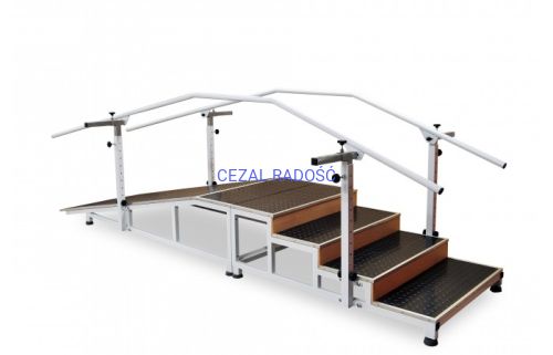 Schody do nauki chodzenia z pochylnią zaprojektowane są z myślą o rehabilitacji i ćwiczeniach osób, które mają problemy z poruszaniem się lub utraciły zdolność chodzenia. Ćwiczenia przy pochylni mogą być pomocne w korekcji chorób i wad rozwojowych kończyn dolnych dzieci i dorosłych, umożliwia to regulacja wysokości oraz rozstaw poręczy. Stopnie schodów oraz pochylnia zostały pokryte antypoślizgową wykładziną gumową, reszta konstrukcji wykonana jest ze stalowych profili malowanych proszkowo farbą odporną na zarysowania.