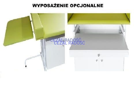 Stolik przeznaczony jest do badania oraz pielęgnacji niemowląt zarówno w placówka medycznych, przychodnia jak również w szpitalach. Wyróżnia się komfortem, wysoką estetyką wykonania. Leże osłonięte jest z trzech stron wysoką pianką, obitą wysokiej jakości skórą ekologiczną co daję gwarancję bezpieczeństwa naszym małym pacjentom. Tapicerka blatu dostępna jest w szerokiej gamie kolorystycznej. Podstawa stolika wykonana jest ze stalowych profili, które gwarantują stabilność oraz wytrzymałość. Konstrukcja stalowa w standardzie malowana jest proszkowo na kolor biały. Dodatkowo stolik wyposażony jest w regulowane stopki umożliwiające jego dostosowanie do nierówności powierzchni. Opcjonalnie stolik może być dodatkowo wyposażony w wysuwaną przednią półkę czy też półkę boczną.