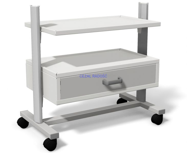 Stolik STA 08 idealnie nadaje się jako wyposażenie gabinetów lekarskich, kosmetycznych oraz innych placówek medycznych. Stolik jest przeznaczony do przewozu aparatury medycznej i narzędzi. Dzięki mobilnej podstawie wyposażonej w 4 kółka jezdne z hamulcem znacznie usprawnia pracę. Konstrukcja stolika jest wykonana ze stali oraz aluminium pokrytym lakierem proszkowym. Stolik posiada 1 szufladę, 2 półki, których tace są wykonane ze stali pokrytej białym lakierem proszkowym. Zaletą stolika jest ustawianie szuflady i półek na dowolnej wysokości.
