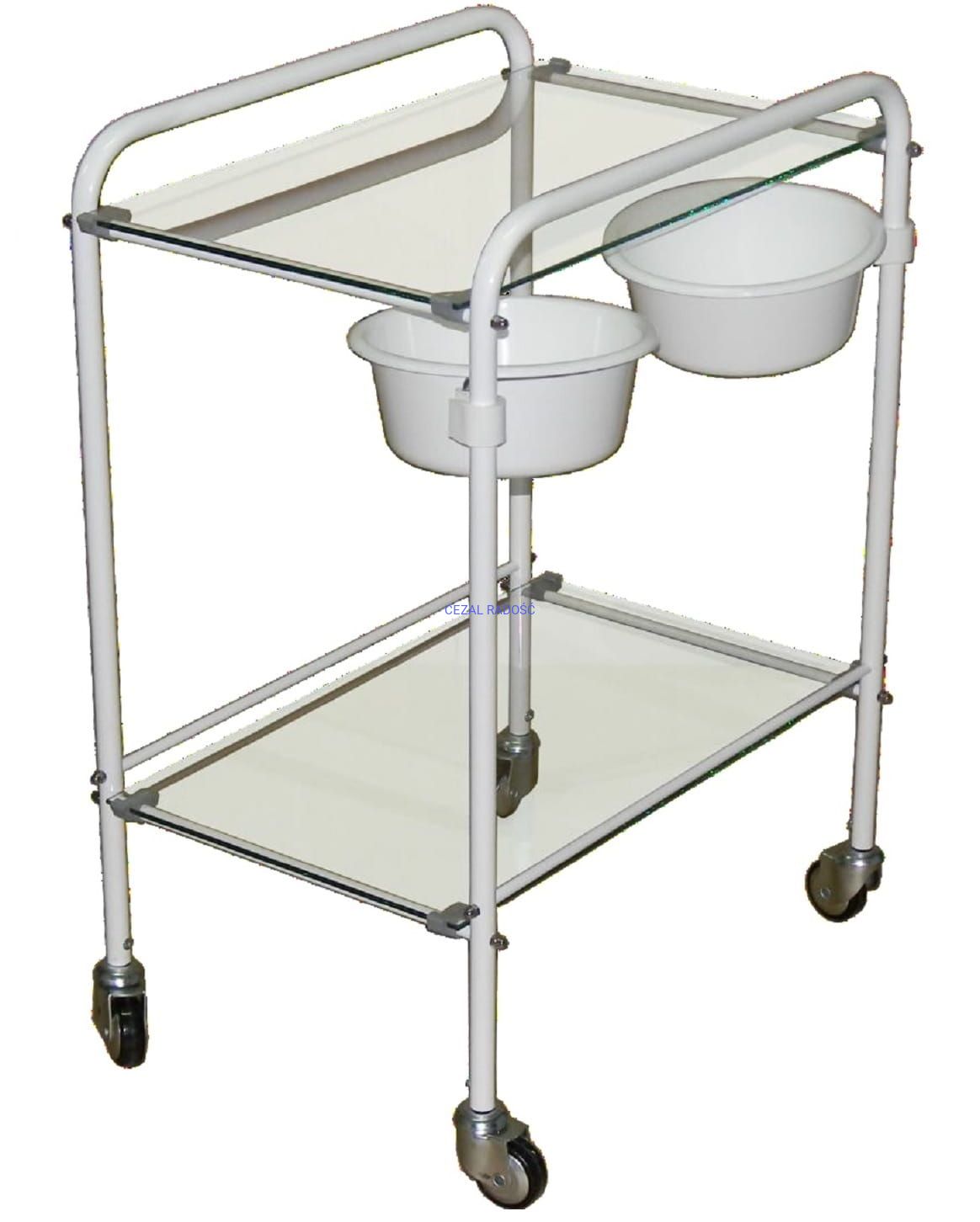 Stolik zabiegowy niezbędny w szpitalach lub domach opieki. Wózek jest wielofunkcyjny, bardzo mobilny oraz lekki. Konstrukcja jest wykonana z metalowych rurek lakierowanych proszkowo na kolor biały. Dodatkowo wózek wyposażony jest w dwie szklane półki, miskę z tworzywa. Wózek posiada cztery kółka jezdne.