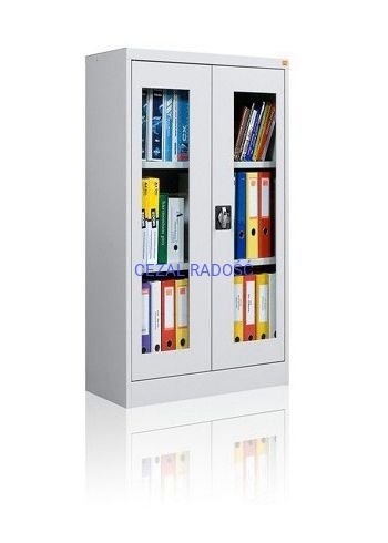 Szafa witrynowa z przeszklonymi skrzydłami wypełnionymi szkłem hartowanym. Szafa posiada dwie metalowe półki. Drzwi zamykane w trzech punktach zamkami baskwilowymi posiadają uchwyty klamkowe. Szafa wykonana z blachy czarnej o grubości 0,8 – 1 mm malowanej farbami proszkowymi (jasny popiel).