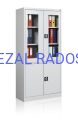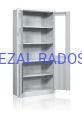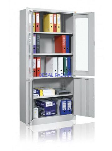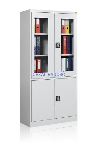 Dwudzielna szafa witrynowa; górna część przeszklona szkłem hartowanym posiada dwie metalowe półki, część dolna wyposażona w pełne drzwi oraz jedną metalową półkę. Drzwi zamykane w trzech punktach zamkami baskwilowymi posiadają uchwyty klamkowe. Szafa wykonana z blachy czarnej o grubości 0,8 – 1 mm malowanej farbami proszkowymi (jasny popiel).