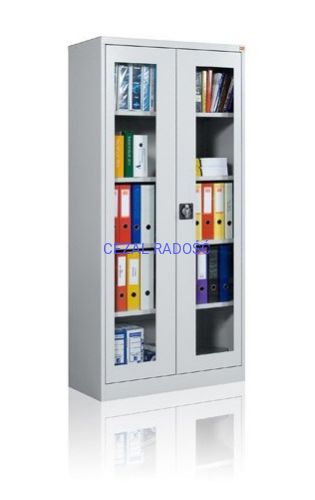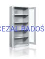 Szafa witrynowa z przeszklonymi skrzydłami wypełnionymi szkłem hartowanym. Szafa posiada cztery metalowe półki. Drzwi zamykane w trzech punktach zamkami baskwilowymi posiadają uchwyty klamkowe. Szafa wykonana z blachy czarnej o grubości 0,8 – 1 mm malowanej farbami proszkowymi (jasny popiel).