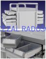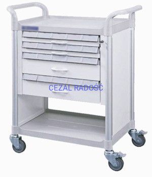 Wózek wykonany z wytrzymałego tworzywa PP na aluminiowej ramie posiada: wygodny blat roboczy, uchwyty oraz panele boczne z tworzywa ABS. Wyposażony w cztery szuflad otwieranych dwustronnie, wyposażone w wyjmowane pojemniki z tworzywa ABS. Wózek zaopatrzony jest w centralny zamek oraz blokadę dwóch kółek.
